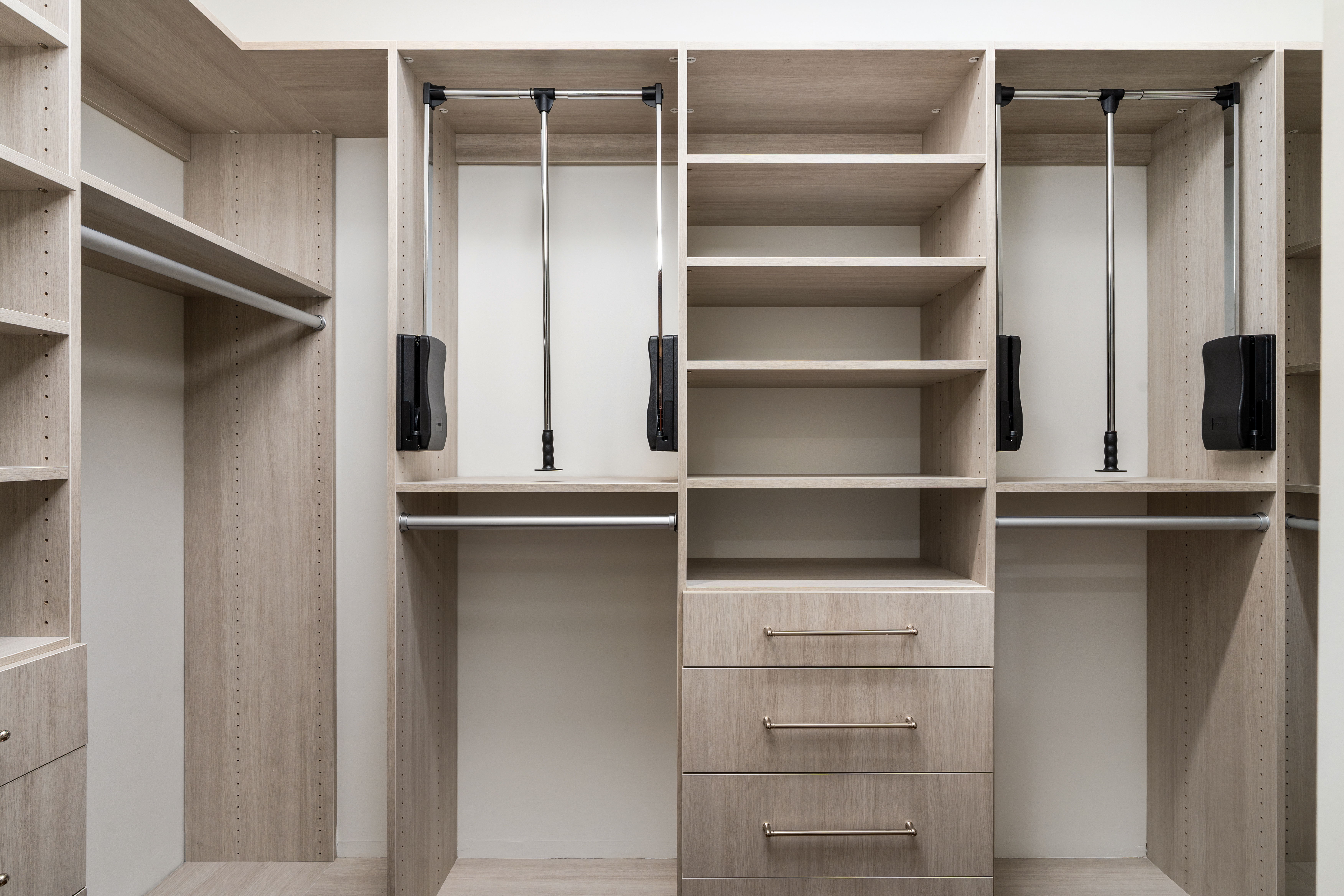 PFC manufactures high-end components using premium materials and the latest in production technology. Their zero-joint edge banding produces flawless, smooth-to-touch radius corners—a key visual and performance detail your customers will notice and appreciate. All wood products are finished with color-matching edge tape in both ¾" and 1½" widths, ensuring clean lines and cohesive aesthetics in every space. With many finishing options and accessories, PFC can bring any closet to life!
